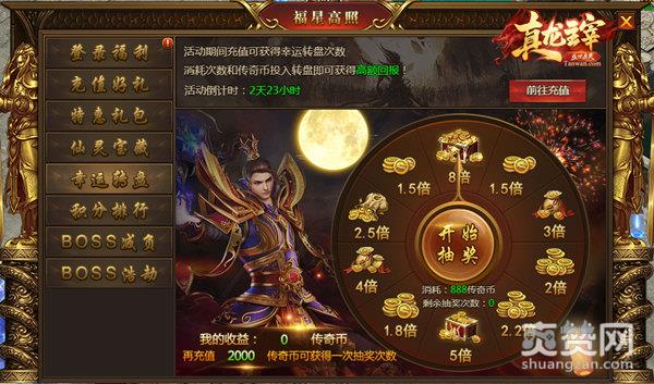 好消息,好消息,活动期间充值可获得幸运转盘次数,消耗转盘次数和传奇币投入转盘可获得高额回报,最高可获得八倍返额,最低也有一点五倍的返额,你还在还等什么?翻倍拿传奇币,这么好的机会,大家不要错过啦!