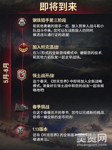随着1.12.1版本的到来,您还将在之后邂逅“7V7坦克混战”、“领土战”、“春季挑战”等众多趣味活动,狂斩更多豪礼,让我们来期待一下。