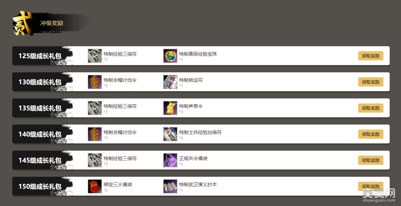 玩家从120级到150级,每升五级都可在活动页面领取一个成长礼包,礼包内含经验符、讨伐令、福袋等道具,全力助阵玩家的升级之旅。除此之外,新手玩家也可以在1级到120级阶段通过招募活动来获取成长礼包。
