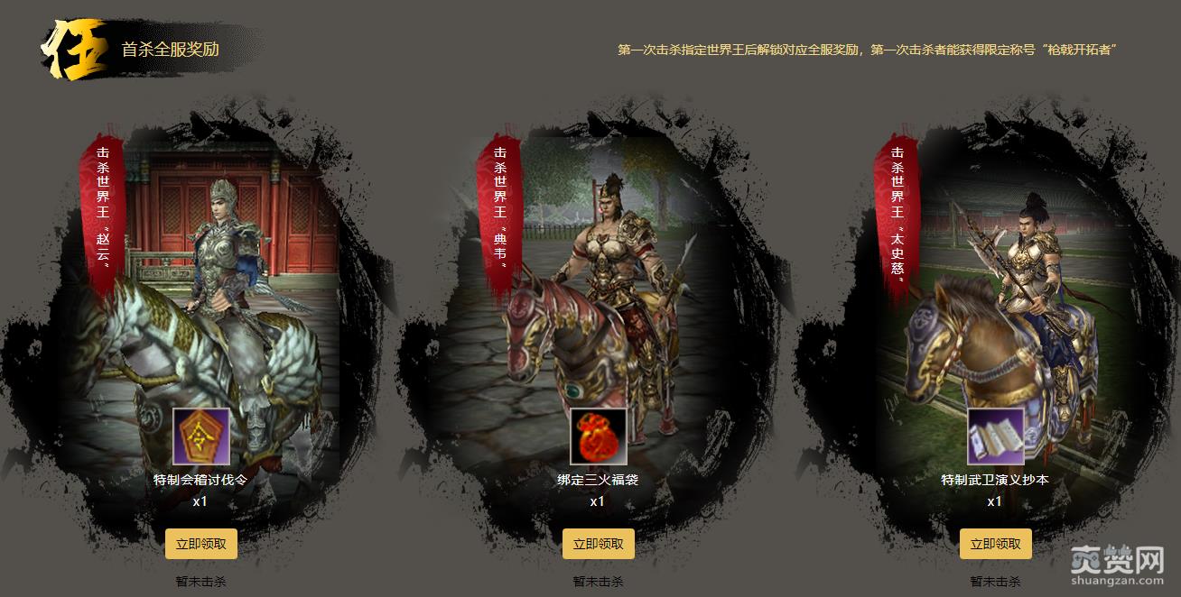 在活动期间,首次击杀“赵云”、“典韦”、“太史慈”这三名世界王将会发放一份全服奖励,第一次击杀世界王的玩家还能够获得限定称号:“枪戟开拓者”。