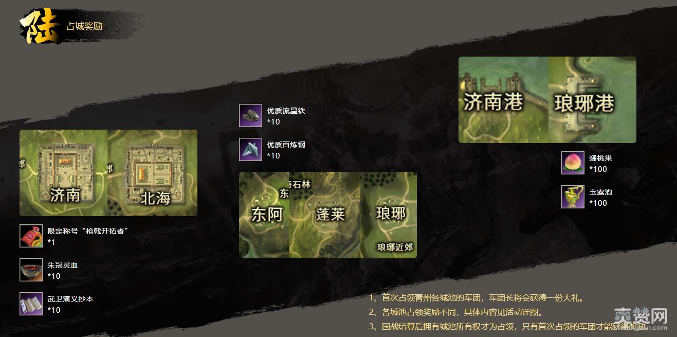 版本更新后,国战中首次占领青州城池的军团,军团长将会获得一份奖励。占领不同城池,取得的奖励也不同。如占领主城“济南”、“北海”可获得限定称号:“枪戟开拓者”和朱冠灵血、武卫演义抄本等稀有道具。
