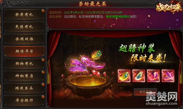 想要轮回神装嘛?想要稀有翅膀神装嘛?那快来寻宝呀!活动期间内轮回神装概率翻倍,更有稀有翅膀神装限时抽取。这次活动能够大大提升战力和时装画面效果!真的是又提升了战力,又给到了人物时装体验,一举两得。你还在等什么?快来跟小编一起寻宝呀!