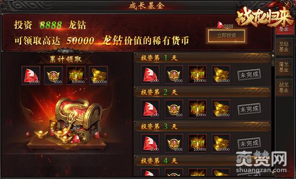 而说到成长基金,这绝对是一个长期的划算生意,就拿第一个8888来说可领取的龙钻就有一万,材料每天都可以领取500-1000荣誉点,元宝每天领取30w-60w不等数额的元宝,还是很划算的,等于就是一分钱不花,白送这些元宝材料。 荣誉点也是很重要的,是升级技能和官印的必要材料,其他的三个档次也是属于长期投资不会亏,相比做这个投资的成长脚步一定会快上很多。