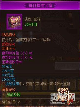 第一军团成员每日可领取俸禄宝箱,随机获得武勋令、武神令、元宝等道具奖励。