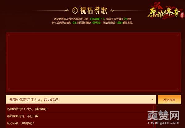 祝福原始传奇,领取豪华元宝,这样的活动也是给所有热爱原始传奇的玩家一个表达对游戏的认可,活动期间每次发送祝福均可获得 一点劳动值,该环节每天最多5次哦,参与活动还会抽取10名幸运玩家赠送100元宝,活动结束后一周内邮件发放。快来参与活动呀!