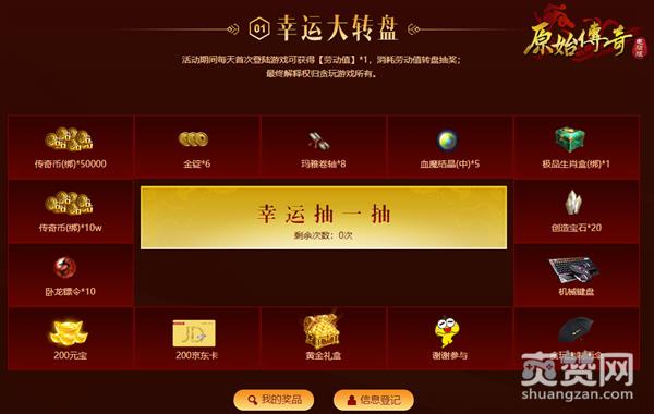 幸运大转盘,各种豪华材料,而且出了游戏里面的礼品以外,更有200京东卡,酷炫机械键盘,贪玩定制雨伞派送哦。活动期间每天首次登陆游戏可获得一点劳动值,包括每天祝福5次就可以获得5点劳动值哦,消耗劳动值就可参与转盘抽奖啦!
