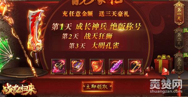 充值任意金额,就可以领取三天的豪礼,最小的充值,换取最大的利益,奖励内容有传承武器、经验加成buff、绝版称号、主角坐骑和翅膀、秘宝钥匙等。而且进入游戏跑主线任务跑到一定等级会触发这个限时首充的一个小福利,充个首充可以顺便把这额外的龙钻领取回去。这是相当划算啦!