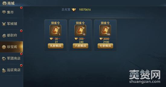35级开放珍宝阁,珍宝阁中出售所有武将宝物碎片。珍宝阁默认开放白色宝物碎片售卖,当玩家等级到达35、45、55、65、75级时,会分别开放绿色、蓝色、紫色、橙色、红色宝物碎片售卖。珍宝阁中每日会重置商品折扣。