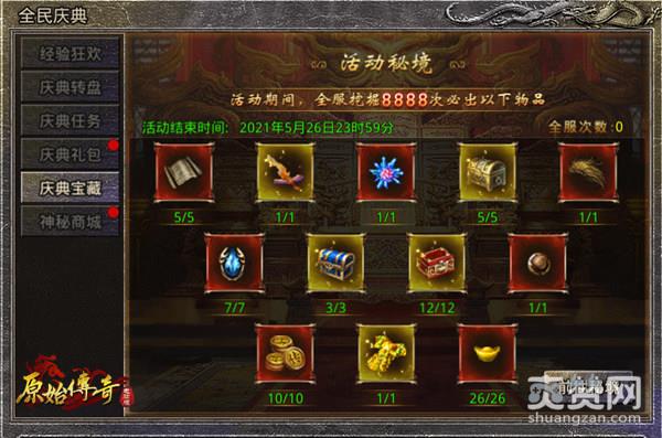 庆典宝藏又称活动秘境,活动期间全服挖掘8888次必出豪华材料和元宝奖励,这个活动可谓是针对全服玩家的活动,需要兄弟们一起努力才能够得到丰富的材料,和资源奖励。这也是让大家能感觉到原始传奇兄弟齐心,必赢天下的感受吧!快来参加这次庆典宝藏活动吧!