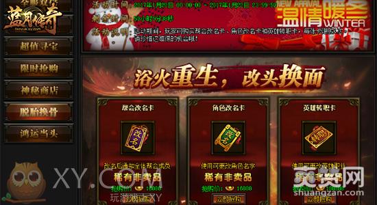 新年就该有新气象,改个新名字如何?此次 XY游戏《蓝月传奇》暖冬盛宴为大家准备了改名卡特卖会!不论是帮会改名卡还是角色改名卡,在活动期间都可以低价抢购。不过,这些稀有的非卖品在活动期间都只能购买一次,使用的时候一定要慎重哦!除了改名卡,XY游戏《蓝月传奇》稀有英雄转职卡也将同步上架。是否对自己跟随的英雄职业不够满意?是否觉得自己一个法师后面又跟了一个法师不够拉风?还是觉得对合击技不够满意呢?那就快来给自己的英雄转个职吧!
