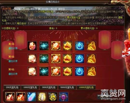 活动期间,每天累计提取元宝达到指定数量即可领取对应的充值礼包,每天零点重置并以邮件补发未领取的奖励。同时,活动期间累计提取元宝达到20万以上的玩家可参与充值排名,活动结束后以邮件形式发放排名前三的奖励。