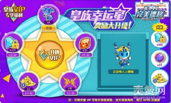 皇族VIP专享福利上线!05月20日—06月02日期间,尊贵的皇族VIP每天可抽取皇族幸运星。在线一定的时间即可领取丰厚奖励!除了零件道具,更有海量金币钻石等着你!活动每日刷新,争做榜上最亮的那颗幸运星吧!