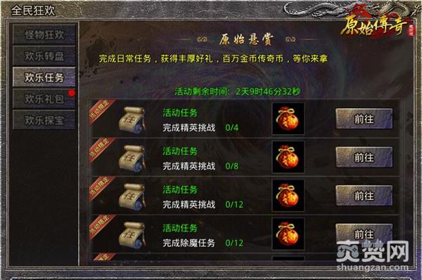 豪华的欢乐悬赏任务又称原始悬赏,只要兄弟们悬赏BOSS的多,光明的玛法大陆肯定会重现的!而且完成精英挑战和除魔任务即可获得丰富的好礼,比如说百万金币,十万传奇币,各种稀有材料~,小编看着都直流口水啦!快来参加此次庆典任务吧!