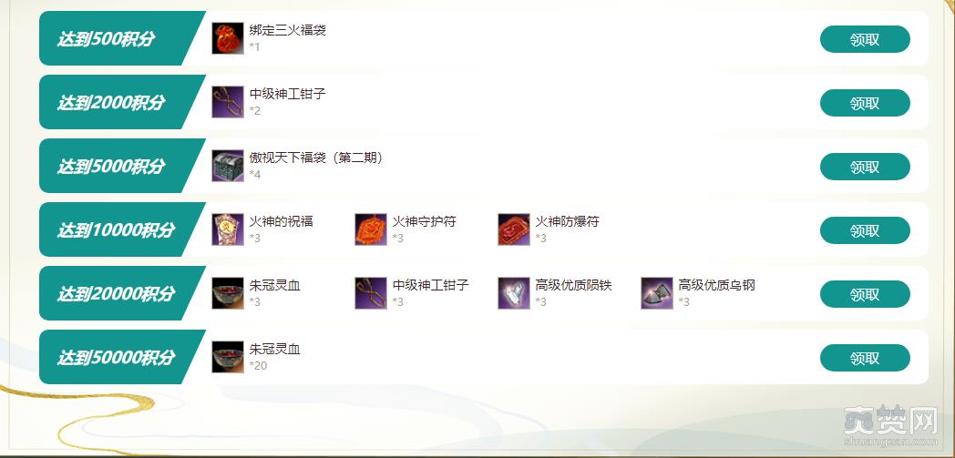 活动期间,玩家在游戏内打开【正规兵令福袋】、【精锐兵令福袋】、【纯白礼盒】、【纯白大礼盒】、【傲视天下福袋(第二期)】等道具,即可获得活动积分,达到一定积分就能在活动页面领取相应的奖励,可以获得三火、中级神工钳子、朱冠灵血等稀有道具。开袋赢豪礼,让玩家的每一分付出皆有所得。