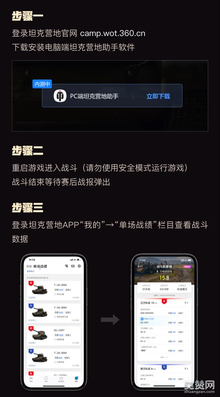 现在只需登录坦克营地官网下载安装PC端坦克营地助手,然后重启游戏并进行一场战斗,战斗模式包括:标准模式、排位赛、领土战、要塞模式、训练模式均可;待战斗结束后弹出战报界面即可完成本局战绩的自动上传,随后在坦克营地APP中“我的”界面中点击“单场战绩”,便可查看刚上传的战斗数据啦!