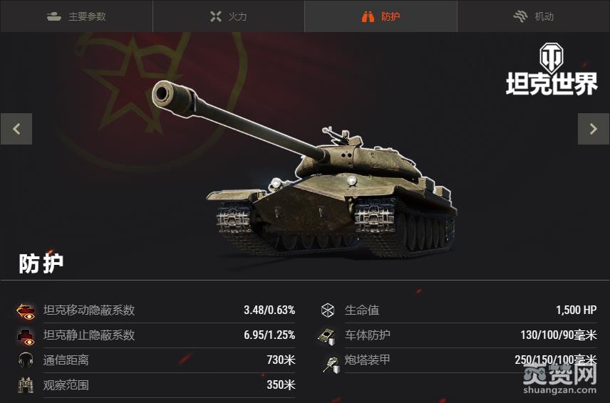 这辆来自S系的8级重坦身披厚重的钢铁外衣,他的炮塔坚固、紧实且形状偏圆,倾斜的车体装甲让敌人的炮弹有很大几率会发生跳弹和未击穿,其炮塔的前额装甲厚度高达250毫米,等效装甲更是达到了500毫米;车身的首上装甲厚度为130毫米,但箭簇型的装甲倾斜角度则大大提升了它的等效装甲;可以说除了炮盾外,几乎所有部位都是倾斜的,因此敌方需要派出等级更高的坦克,并装配上特殊炮弹,才能尝试从正面击穿252工程U的炮塔装甲。