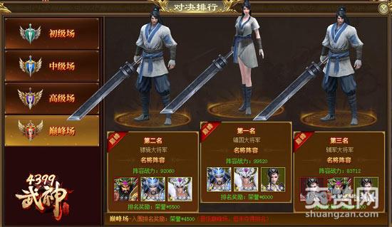 武将培养的好不好,让《4399武神三国志》名将对决玩法帮你验证。名将对决是一个让你的武将上阵出战的竞技场,一共分为初级场、中级场、高级场和巅峰场,打败镇国大将军,你的武将将成为名将榜上的巅峰!
