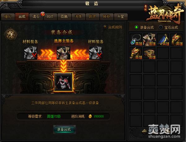 合成也是锻造里面很重要的,合成装备是将三件相同的装备合成为更高等级的装备(例如:三件60级武器合成为一件70级武器)。但大家记住,这个合成系统只能合成50,60,70级等级的装备,并且合成的三件装备中有绑定装备,那么合成出来的装备也是绑定的。贪玩平台《蓝月传奇》的主线任务也有装备等级的要求,因此在不购买神装礼包的情况下我们可以通过个人副本,材料副本,与地下宫殿。积攒大量的50级装备,再配合金币加以合成,以满足我们做主线任务的要求。