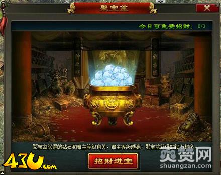 在聚宝盆中,玩家可领取钻石奖励,等级越高,可领取的也就越多。在官职增加够,玩家还可多10次元宝招财的机会哦!这是获得钻石的有效途径,玩家千万不要错过了哦!