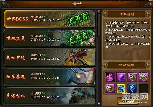 【日常活动】:分为世界BOSS、欢乐答题、阳光沙滩、怪物攻城、蟠桃盛筵、美女护送、多倍挂机、帮派BOSS、热血战场、修罗塔、休闲挂机、皇城争霸