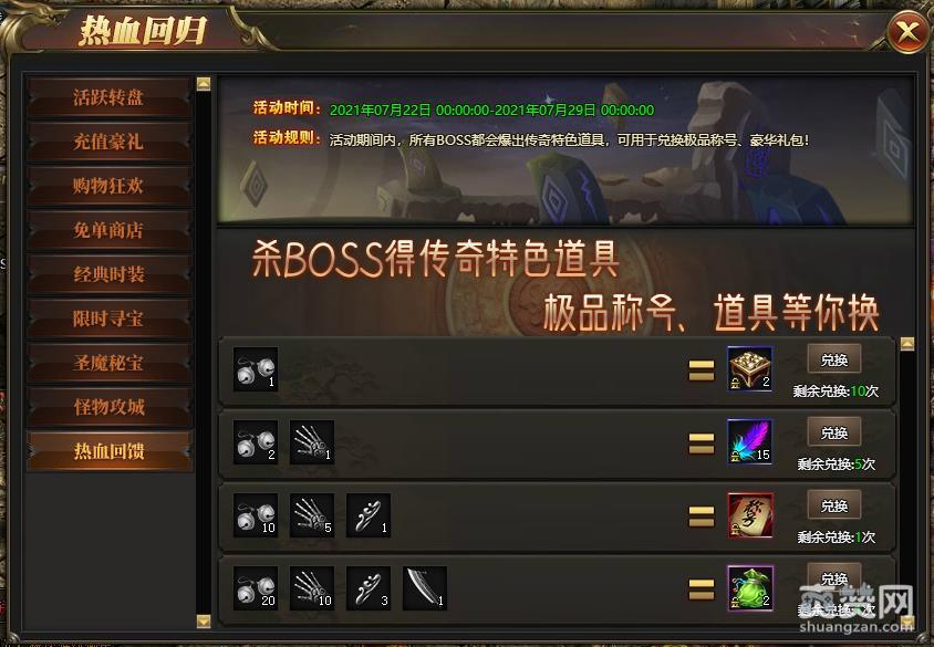 活动期间,所有BOSS都可掉落传奇特色道具,收集指定道具,就可兑换豪华礼包!刷多兑多,极品荣耀称号等你免费兑换!谁能最先戴上极品称号,那就看谁上线最快、刷得最勤了!