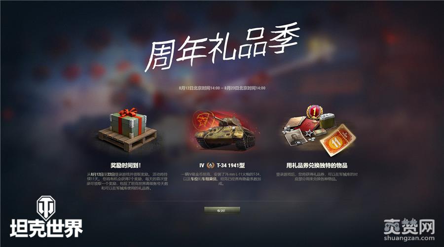 热闹非凡的周年庆活动将从8月12日14:00至8月23日14:00期间举办,活动将通过周年礼物的形式向所有车长们致敬!为了感谢大家的陪伴和支持,4级S系金币中坦“T-34 1941型”将作为第一份周年礼物赠送给所有登录《坦克世界》的玩家!