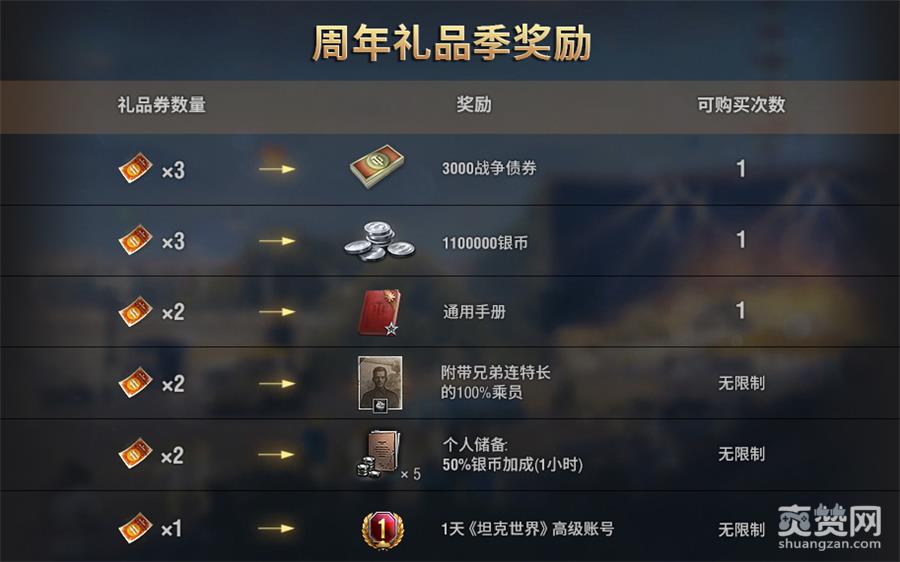 进入琳良满目的周年礼物商店,这里有着大量物品等您兑换,高级账号天数、战争债券、乘员手册、银币、附带兄弟连技能的乘员、银币加成个人储备等奖励应有尽有,快使用7张礼品卷,在炎炎夏日签收您的专属战利品吧!
