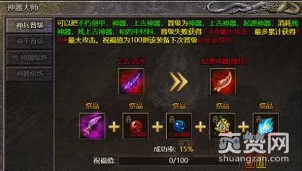 八大神器可以通过晋级和熔炼获得更高级别的神器。3件残神器作为材料熔炼时,有一定几率成功,成功后随机获得更高级别的1件残神器,失败则返回对应层级的随机神器。残神器可晋级为成品神器,需消耗1件残神器和对应数量的晋级材料,晋级失败会获得祝福值,祝福值满时下次晋级100%成功。