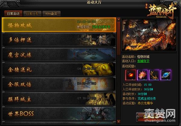 怪物攻城会在15:00开始,活动开始前会有提示,活动开始的时候玩家可以通过右上角活动提示直接传送到活动地点,怪物攻城会持续30分钟,玩家需要在怪物攻城的30分钟内尽己所能地消灭怪物,怪物通常会聚集在一起,攻击遇见的每一个人,如果战斗力不够的玩家建议组队前往,快来贪玩平台《蓝月传奇》与古天乐一起消灭怪物,成为蓝月城的英雄吧!
