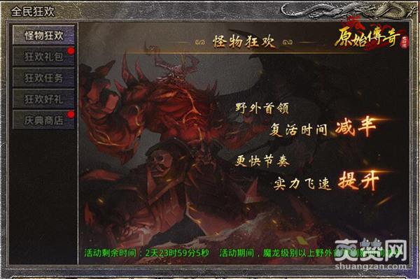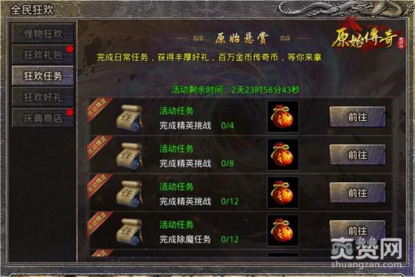 豪华的原始悬赏任务,只需完成精英挑战和除魔任务即可完成狂欢任务,而且完成狂欢任务还有丰富的好礼,比如说百万金币,十万传奇币,各种稀有材料~,小编看着都直流口水啦!快来参加此次狂欢任务吧!