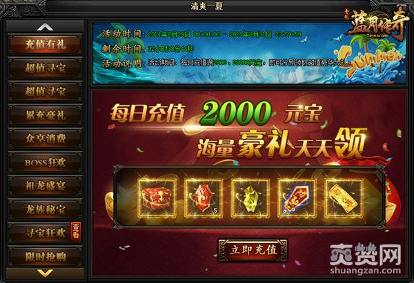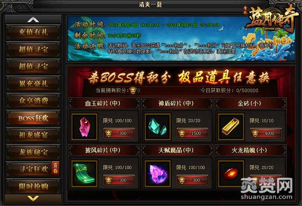 清爽一夏是贪玩平台《蓝月传奇》给玩家带来的一系列福利活动,清爽一夏活动时间为8.29-8.31日,玩家要抓紧时间参加活动了!活动内容包括有:充值有礼、超值寻宝、BOSS狂欢、祖龙盛宴、龙族秘宝、寻宝狂欢、神秘商店、鸿运当头等,琳琅满目的丰富活动和丰厚的各种道具奖励真是让人心动呀!这些活动多得让人有点看不过来了,这里小编重点给大家介绍我最喜欢的BOSS狂欢活动。