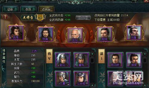 点将台会自动选择最强的武将作为上将,随着等级的开放,会有更多的主将和谋士的位置,来继承上将的属性,在自身的基础上在增加统率、武力、智力、酒馆兵力,还有武将的等级、转生次数、水军等级会变成继承属性的数值,各位主公们,继承的武将无法进行酒馆增加属性、训练、顿悟、贬职哦!