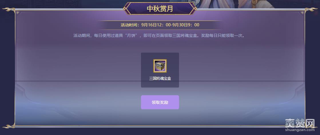 活动期间,玩家每日在游戏内使用过道具“月饼”,即可在活动页面领取三国将魂宝盒。奖励每日只能领取一次。开启宝盒后可以获得一个随机将魂。每日领取礼盒,加速将魂收集之旅!