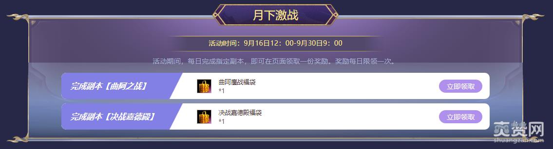 在活动期间,玩家每日通关指定副本,就能在活动页面领取一份福袋奖励。开启福袋后,玩家可获得朱冠灵血、兵令福袋等高价值道具!樽前月下,等你来战!