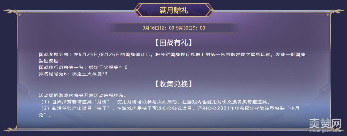 除以上活动外,玩家们还可在游戏中参与更多精彩活动。在9月25日和9月26日的国战统计后,国战排行总榜上排名第一以及排名尾号为6的玩家们都可以获得“绑定三火福袋”道具。同时在中秋活动期间,在三国世界内击败任意怪物将限时掉落道具“月饼”;每日与NPC兔仙人对话可获得“柚子”道具,玩家可使用这两样限时道具在NPC物品兑换商人处兑换各式奇趣道具及2021年中秋限定坐骑造型“小月兔”。