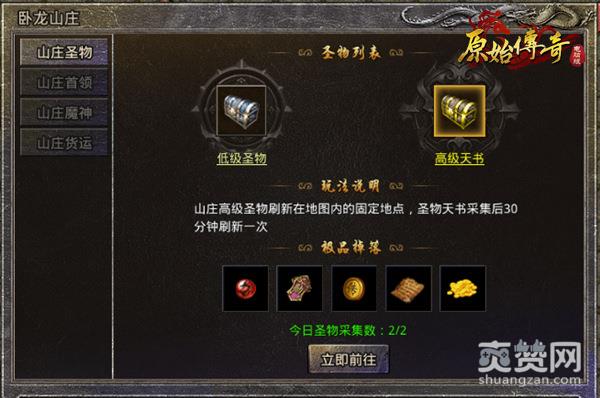 山庄高级圣物刷新在地图内的固定地点,圣物天书采集后30分钟刷新一次,采集后可以获得功勋,传奇币,技能书页,金币,高级天书有几率获得卧龙镖令,是押运高级镖车的材料