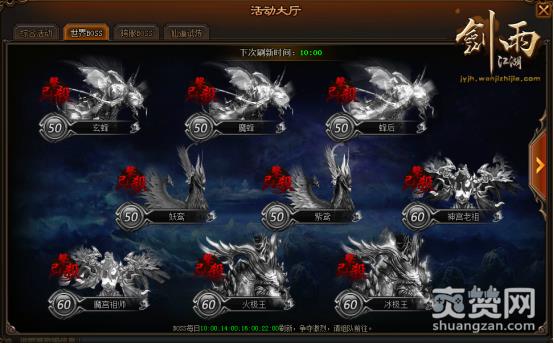 力强悍世界BOSS!世界BOSS,全员出击!在玩机之家《剑雨江湖》的武侠世界中,每天10:0、14:00、16:00、22:00这四个四段,世界的各个角落都会有BOSS出现,譬如说落秋岭上的BOSS玄蜂、寒窟中的高冷冰极王、五仙密境中的暗影魔蝎、极乐圣地内的极乐大帝等等等。而身为剑雨侠客的玩家们,可以根据系统提醒,踏入BOSS所盘踞的地域,与其他的玩家一同进行激烈的争夺。不过,话说这世界BOSS可是特么的凶残,而且实力也是十分强悍,所以在此小编建议,最好组队前往吧。