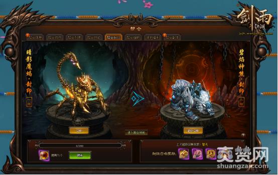 召唤来袭帮派BOSS!不仅世界的某些角落会有BOSS来袭,其实在本以为十分安全的玩机之家《剑雨江湖》的帮会驻地中,也会有“帮会BOSS”存在。只不过相比起自由出没的世界BOSS大咖们,这帮会BOSS可就“温和”得多了。因为他们只有在帮主或者副帮主的召唤之下才会出现,平常时候一般都是被封印住的。当然,据说如果被召唤出现,帮会BOSS也不是单人能够惹得起的哦,需要各位成员共同努力才能将它制服!