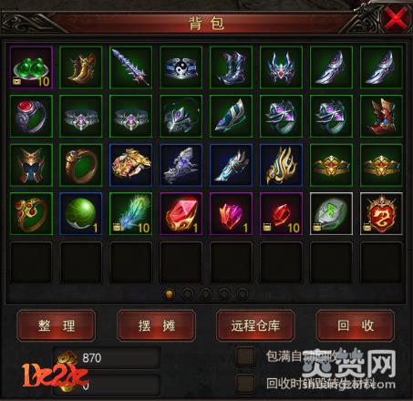 在背包系统中,可以存放玩家获得战利品、装备、道具金币、元宝等道具,玩家可以进行整理背包,快速出售等相关操作。