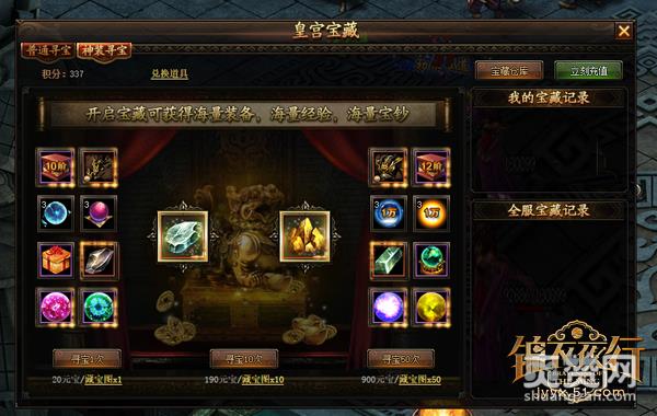 皇宫宝藏系统是51《锦衣夜行》中使用元宝随机抽取奖励的系统,奖励中不仅9阶的武器与衣服,还有10阶随机部位的制作图纸,高级灵武等外面难得一见的珍宝,绝对是玩家获得极品装备建立前期优势,或中后期反超对手的绝佳途径!玩家探索一次只需要20元宝,探索10次需要190元宝,而探索50次只需900元宝,探的越多,优惠越多,而且游戏中多次探索得到极品的概率比单次探宝要高很多!还有海量装备、海量经验、海量宝钞等你拿,让你轻松开启锦衣之路,成就新的传奇人生!