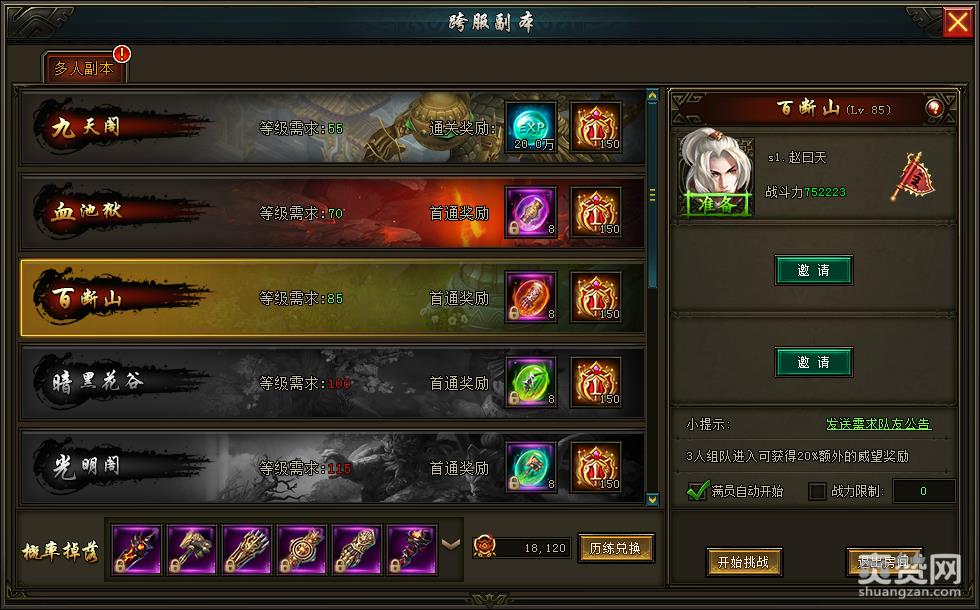 跨服副本,多人副本。当玩家达到55级时,就可以挑战跨服副本。玩家和参与同类型多人副本的玩家组队,或者自动匹配成一个3人的队伍,进入相应等级的副本。每天前30次通关多人副本可获得历练奖励。每天通关30次后参与多人副本,可继续获得副本掉落奖励。副本房间满3人进行通关的副本,可额外获得20%历练值。历练可在商城-历练专区兑换稀有道具。