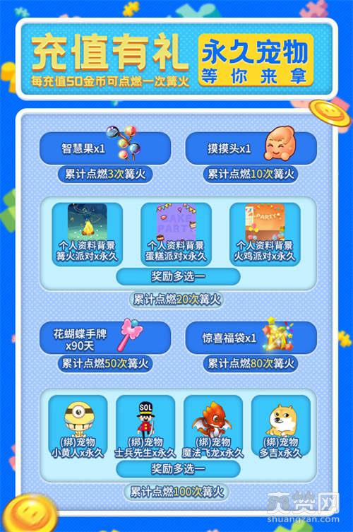 活动期间,让推理之都的篝火点亮整个夜空吧!每充值50金币可点燃一次“篝火”,并从“篝火派对抽奖池”中抽取1份装扮奖励!当您累计点燃100次“篝火”,即可从四款永久宠物中挑选一款,包含:小黄人、士兵先生、魔法飞龙和多吉!
