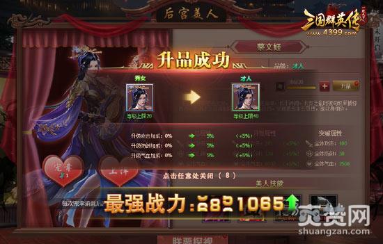 美人升到等级上限后,需要升品,才可继续提升美人等级,升品获得美人升级总属性百分比加成,最高加成50%。