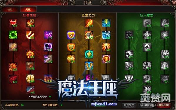 《魔法王座》中的天赋系统,在玩家等级达到一定等级后开启,开启天赋后,玩家可获得8点初始天赋点数,此后等级每提升5级即可获得1个天赋点数——当玩家达到500级满级时,完全可以同时装备两种甚至三种不同的天赋。此外,当玩家希望对已分配的天赋点数进行调整时,则可以使用“天赋重置卡”来重置全部天赋。