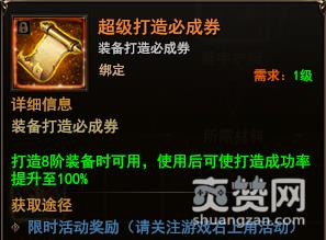小伙伴们超级打造必成券的效果就是让小伙伴们打造八阶装备的时候必成功!这对于许多小伙伴们来说还是非常有吸引力的,我们来算一下,普通的装备必成券要200,那么高级的就是600.超级的是由3张高级的合成而来,也就是1800块!1800块一张超级,小伙伴们还是慎重吧!我们下次再见!
