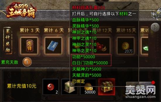3、每日充值累计充值处的材料自选礼盒开启也可以选择功勋进行获得。
