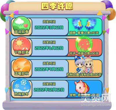 在2022年1月1日 - 2022年12月31日期间,选择任意季节的礼物并投入100金币进行许愿!在2022年的四个季节之中,每个季节都会随机抽取许愿该礼物的10名玩家送出当季奖励!