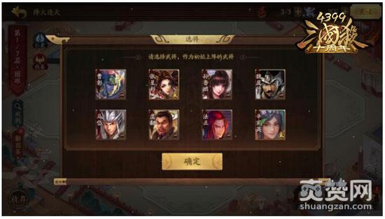 武将选择:该模式中武将分为主将和副将,每场游戏首次进入时会从主公的武将池中随机出8个武将,主公需要从中选择一个作为本场游戏的初始主将,不论主将还是副将都可在后期中可通过各种事件获得。