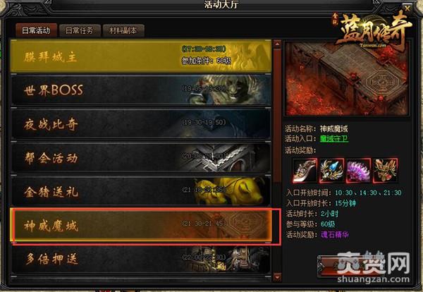 神威魔域入口开放时间:10:30、14:30、21:30,持续15分钟。