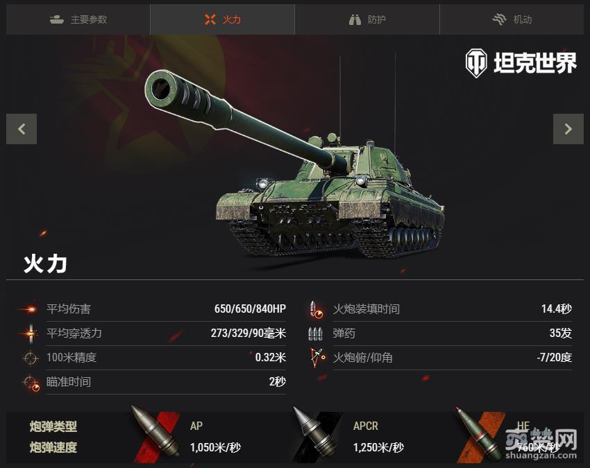 114 SP2可使用AP弹打出650点均伤,平均穿透力为273毫米;而APCR弹更为强横,平均穿透力可达329毫米,炮弹速度高达1250米每秒,针对敌方弱点进行攻击有着出色的歼灭效果。